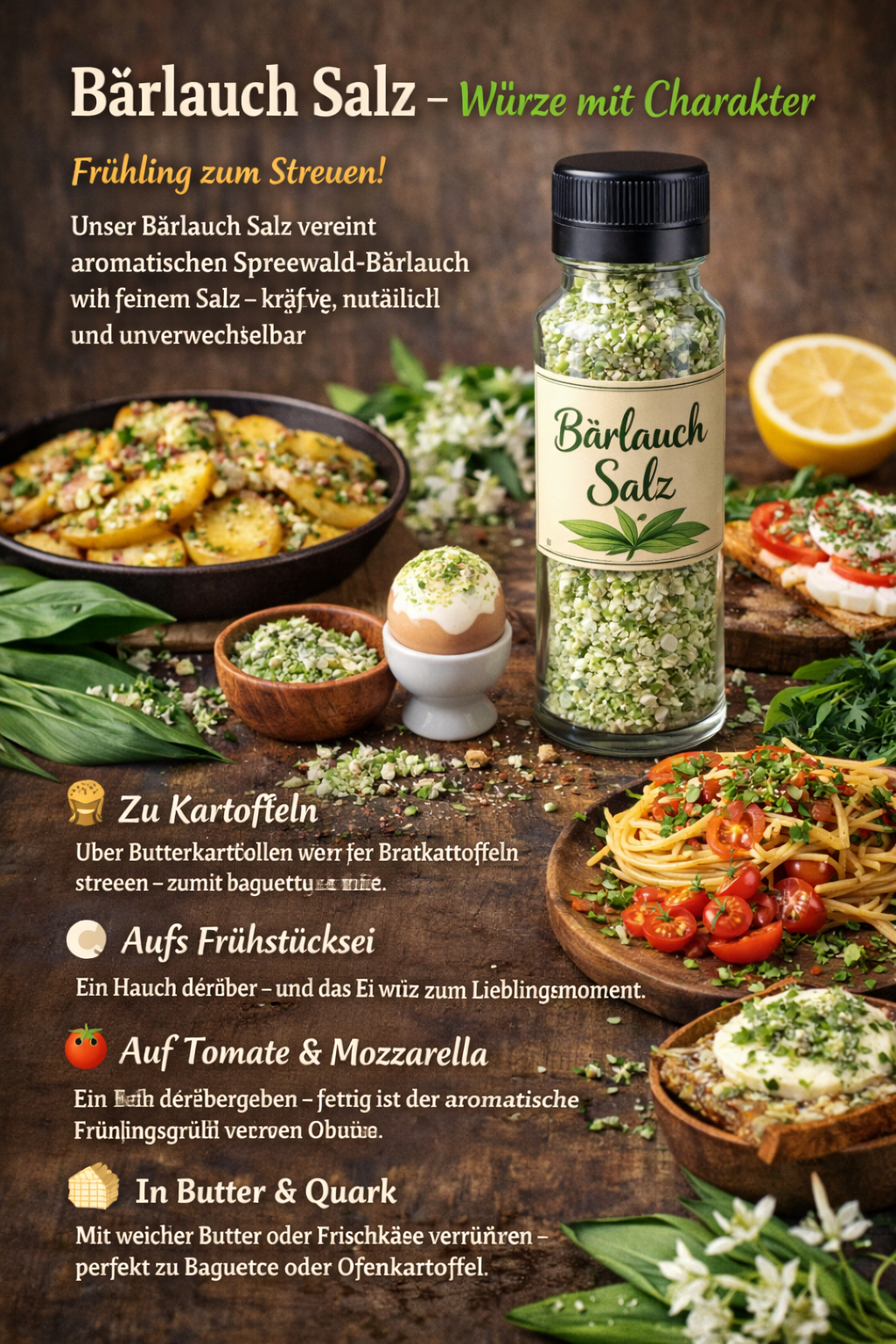 Unser Bärlauch Salz vereint aromatischen Spreewald-Bärlauch mit feinem Salz – kräftig, natürlich und unverwechselbar.