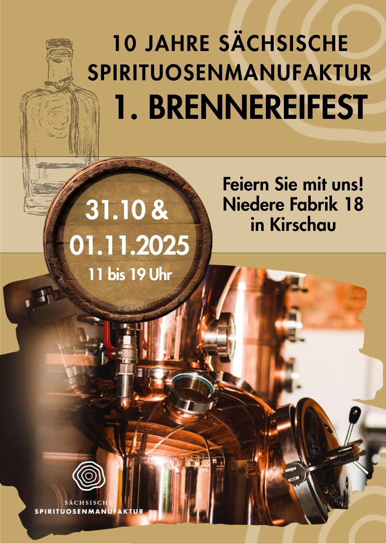 Die Sächsische Spirituosenmanufaktur feiert ihr 10-jähriges Bestehen – und lädt am 31. Oktober und 1. November 2025 zum ersten Brennereifest auf das Manufaktur-Gelände in Kirschau ein.