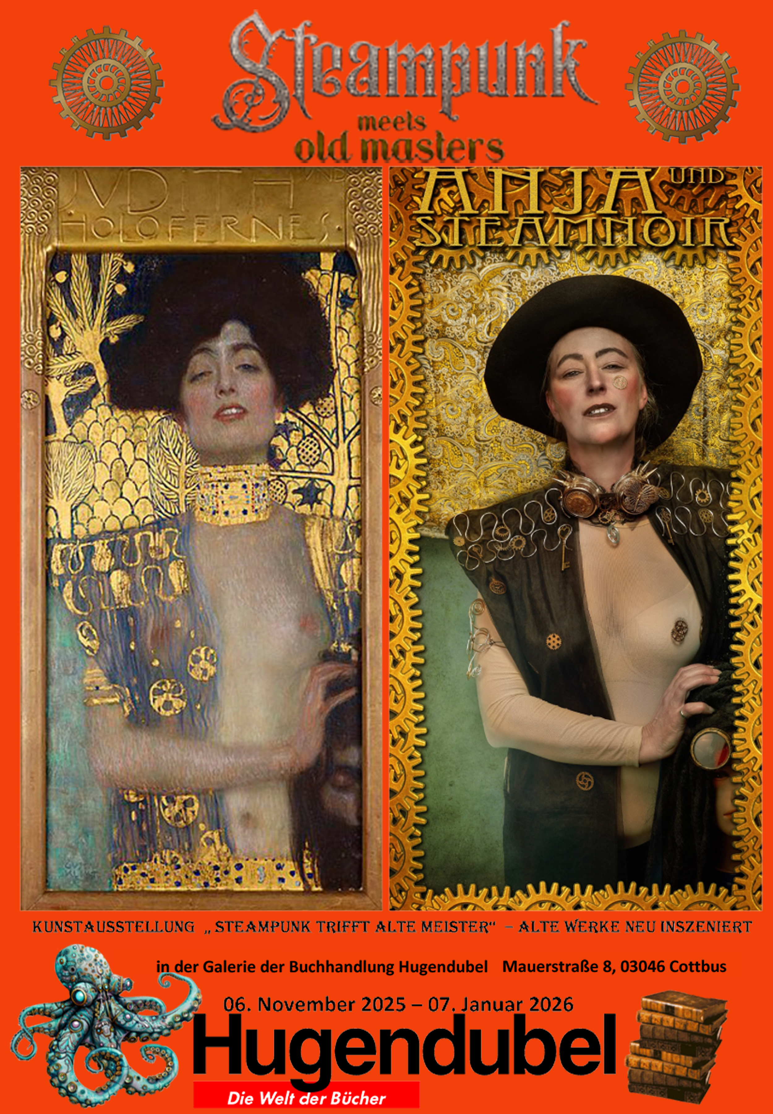 Der Verein Ravenchild aus Cottbus präsentiert unter dem Motto "Streampunk meet Old Masters" vom 06.11.2025 bis 07.01.2026 eine außergewöhnliche Ausstellung in unserer Hugendubel Buchhandlung.
